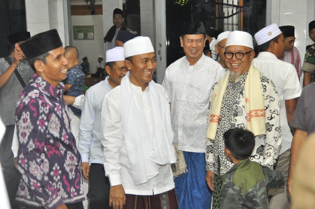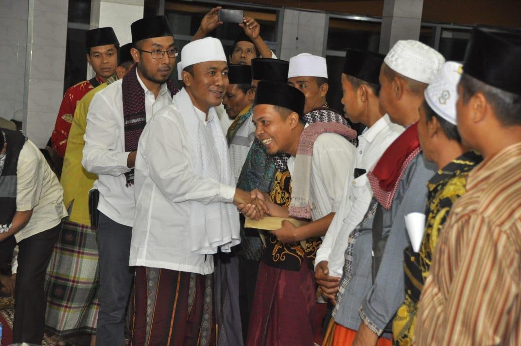 Bupati Lombok Barat H Fauzan Khalid berjabat tangan dengan masyarakat Lombok Barat yang menghadiri Safari Ramadhan di Masjid Baiturahman, Desa Baju Kecamatan Labuapai. (istimewa)