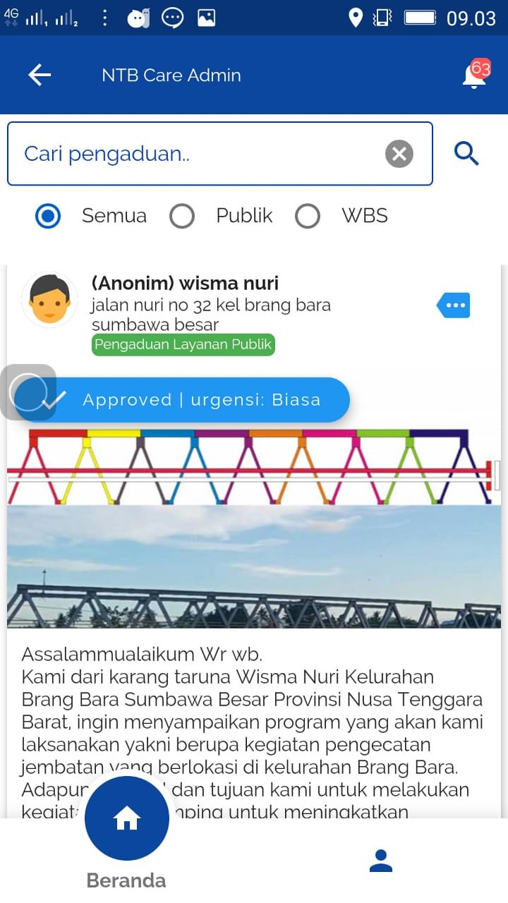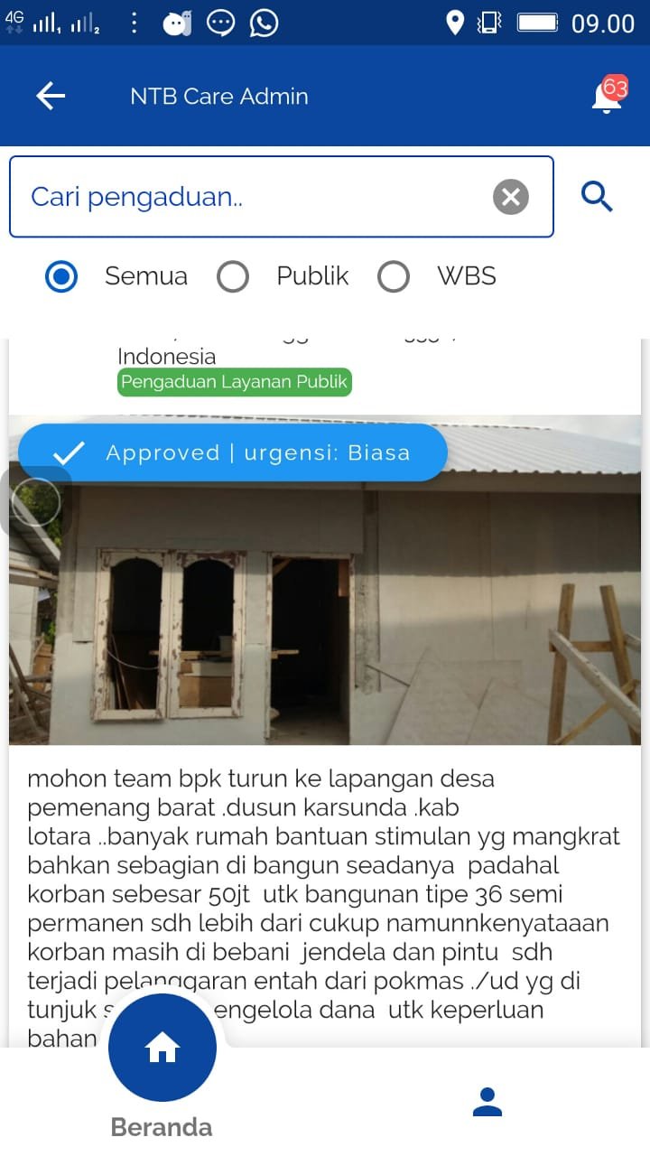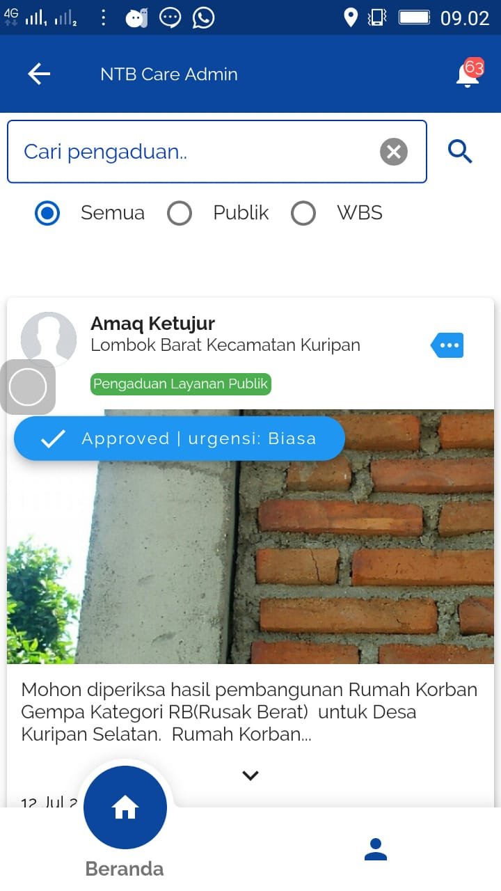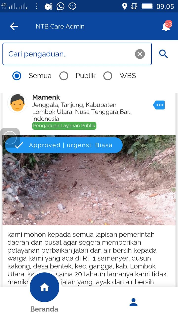 Potret pengaduan warga melalui Aplikasi NTB Care. (Istimewa)