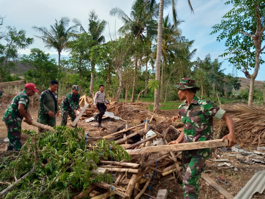 Sebelum penyerahan bantuan berupa kebutuhan perbaikan rumah seperti asbes, semen, paku dan kebutuhan lainnya, anggota Koramil melaksanakan pembersihan puing-puing bangunan yang berserakan bersama pemilik rumah.