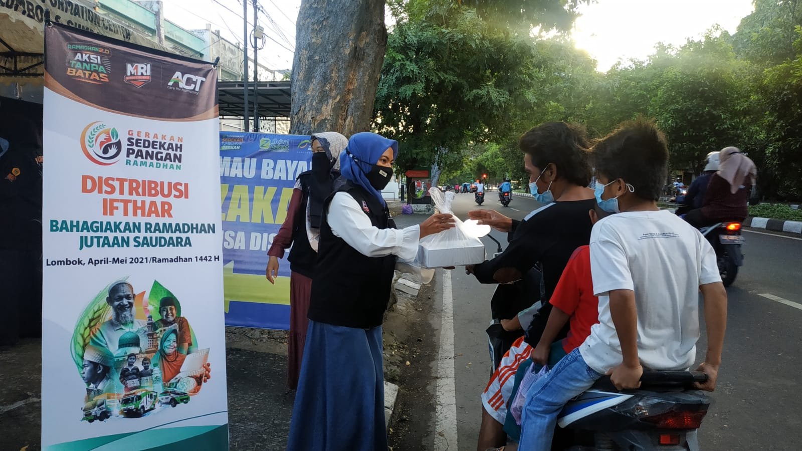 Di hari kedua Ramadhan ini, pembagian paket berbuka dilakukan di halaman kantor ACT NTB. Dimana kantor yang terletak di jalan Sriwijaya ini merupakan jalur padat kendaraan di daerah mataram.