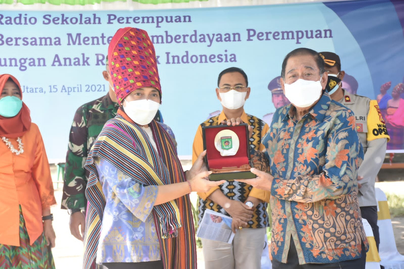 HarianNusa.com, Lombok Utara – Menteri Pemberdayaan Perempuan dan Perlindungan Anak Republik Indonesia (PPPA), Ni Gusti Ayu Bintang Puspayoga, melakukan kunjungan kerja sekaligus meresmikan Radio Sekolah Perempuan Darurat Siaga Covid-19 "Nina Bayan" di Lombok Utara. Kunker tersebut didampingi Bupati Lombok Utara H. Djohan Sjamsu SH beserta Ketua Tim Penggerak PKK KLU Dra Hj Galuh Nurdiyah, berlokasi di Desa Sukadana Bayan (15/4/2021). Hadir pula Asisten I Setda Provinsi NTB Hj Baiq Eva Nurcahya Ningsih MSi, Dandim 1606/Lobar Kolonel Arm Gunawan S Sos MT, Wakapolres Lotara Kompol Setia Wijatono SH, Kadis Sosial dan PPA KLU Drs Faisol MSi, Plt Camat Bayan Muslihin SSos, Kades Sukadana Zul Rahman SH, unsur Tim Institut Kapal Perempuan dan LPSDM, Toga, Toma, serta para undangan lainnya.