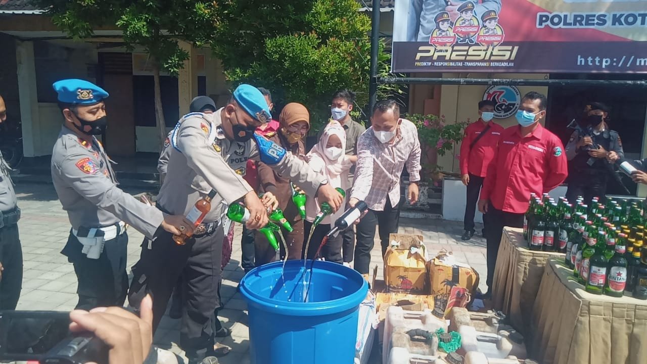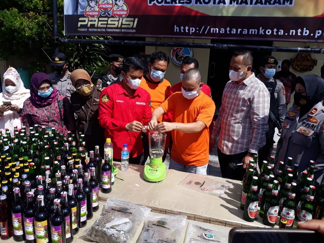 HarianNusa.com, Mataram – Ribuan botol minuman keras (miras) dan sebanyak 1,5 kilogram ganja hasil operasi penyakit masyarakat (Pekat) tahun 2021 yang dilakkan oleh Polresta Mataram dimusnahkan. Pemusnahan dipimpin Kasat Narkoba Polresta Mataram, AKP Yogi Purusa Utama, SIK," di depan Ruang Sat Resnarkoba Polresta Mataram, Kamis (22/04/2021).