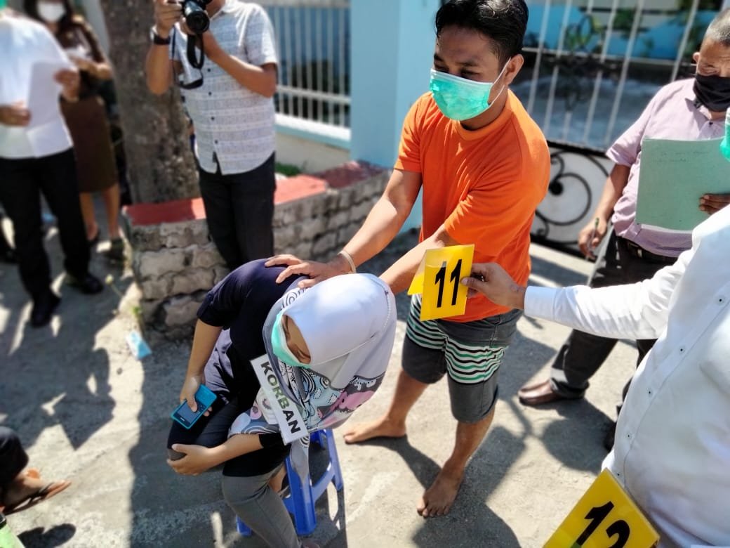 Rekontruksi berlangsung satu jam dimulai pukul 10.00 Wita. Kegiatan lengkap dihadiri jaksa dan penasihat hukum pelaku. Total ada 21 adegan yang diperagakan pelaku saat membunuh istrinya.