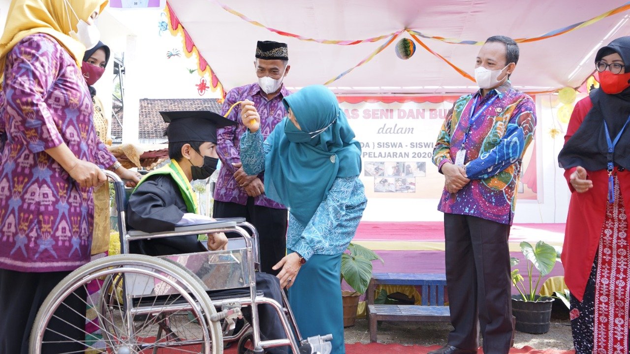 HarianNusa, Mataram – Ketua Tim Penggerak PKK Provinsi NTB, Hj. Niken Saptarini Widyawati Zulkieflimansyah, berkesempatan mewisuda 34 murid dan siswa, SD, SMP, dan SMA, di Sekolah Luar Biasa (SLB) 2 Mataram pada Kamis, 1 Juli 2021.