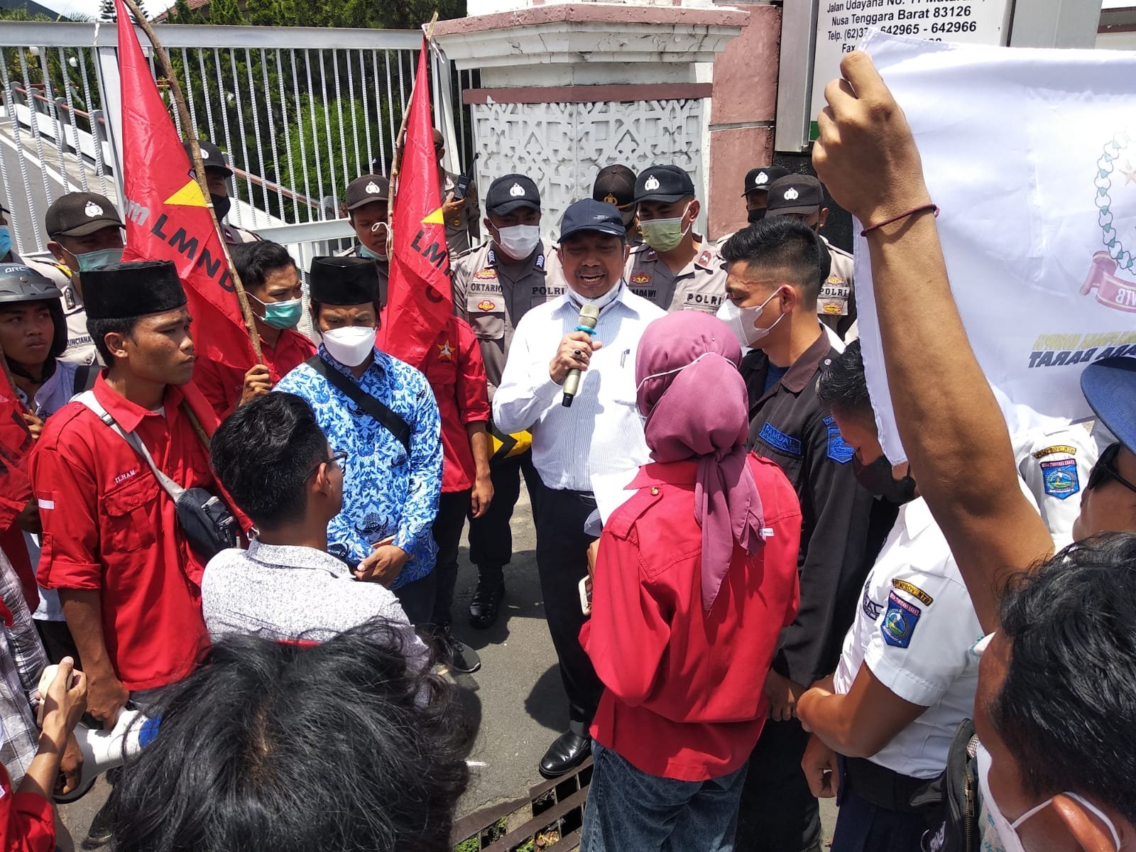 Sekretaris DPRD NTB, H. Mahdi Ahmad, SH. MH., menemukan massa aksi unjuk rasa di depan gedung DPRD NTB. (HarianNusa)