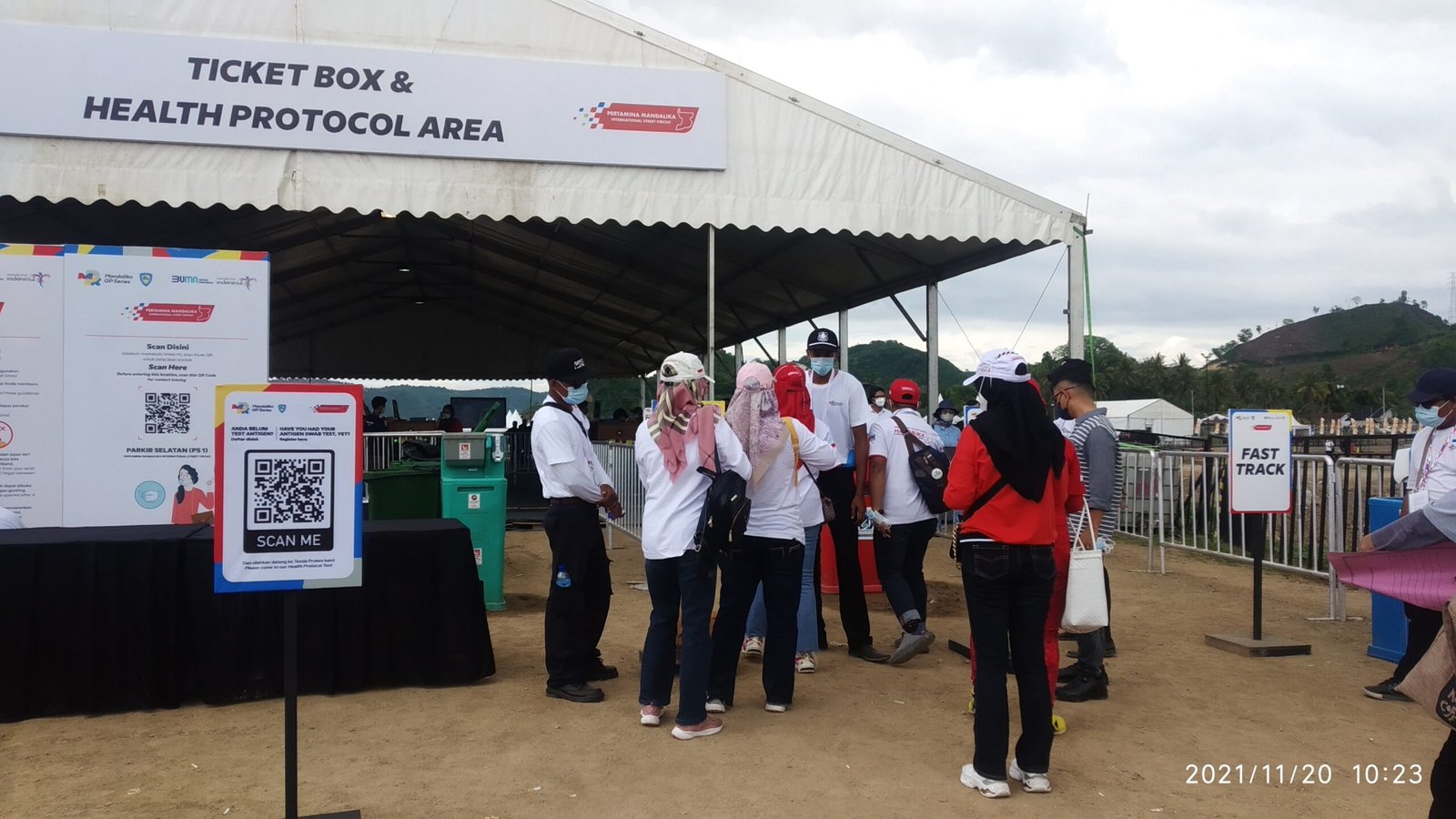 Proses masuk kedalam sirkuit dengan SWAB test, penukaran di ticket box sampai antrian menunggu shuttle bus yang mengantar dari titik parkir sampai lokasi sirkuit yang berjarak agak jauh tak dipersoalkan nya.