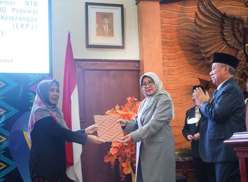 Kepurusan dan Rekomendasi DPRD NTB terhadap LKPJ Gubernur NTB Tahun 2021 itu diserahkan oleh Ketua DPRD NTB Hj. Baiq Isvie Rupaeda dan diterima oleh Wakil Gubernur NTB Dr. Hj. Sitti Rohmi Djalillah.