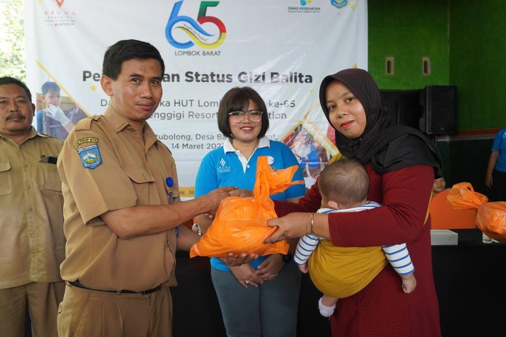 HarianNusa, Lombok Barat – Dukung program pemerintah, khususnya Kabupaten Lombok Barat, dalam pencegahan stunting dan gizi buruk, Aruna Senggigi Resort & Convention mengadakan Pemeriksaan Status Gizi Balita serta pembagian paket sembako di Dusun Batu Bolong, Lombok Barat (14/3).