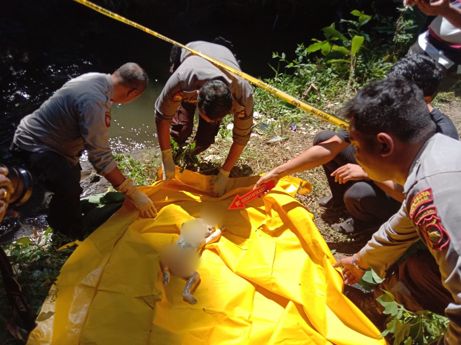 Peristiwa olah TKP penemuan sosok mayat bayi di Kali Dusun Gontoran Daya, Desa Gontoran, Kecamatan Lingsar, Kabupaten Lombok Barat. (Istimewa)
