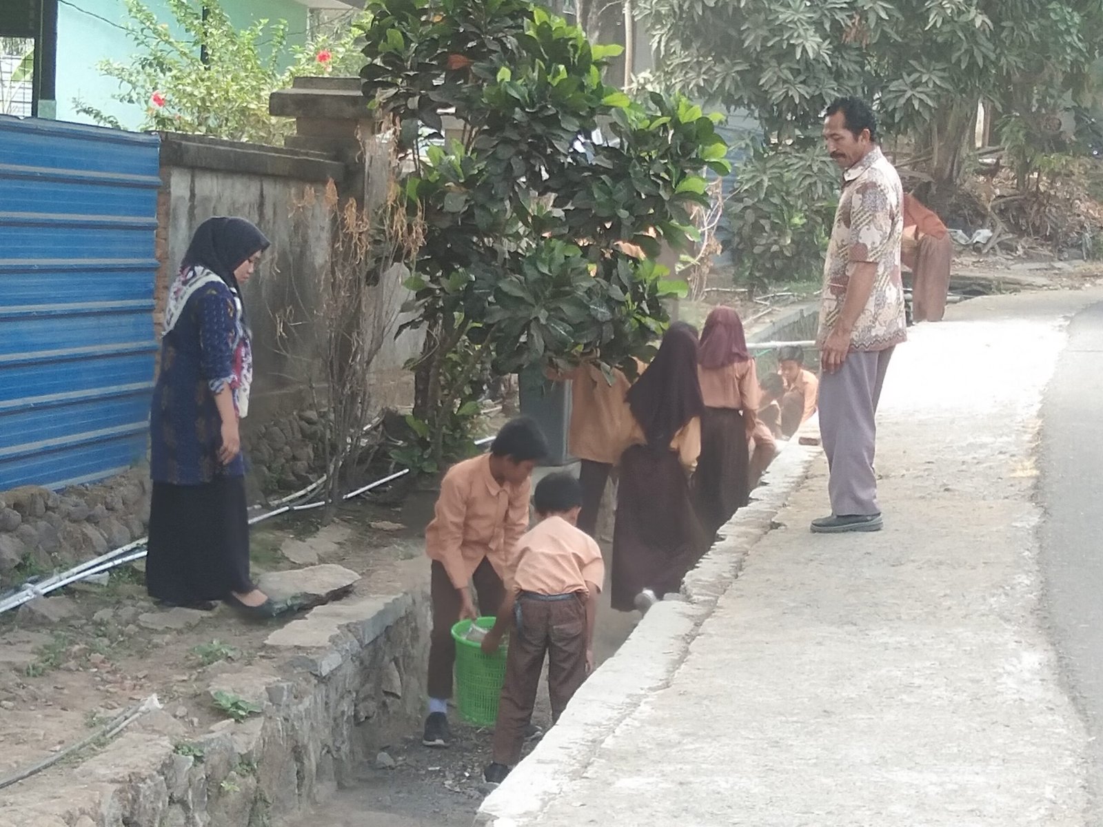 1. Dewan guru mengarahkan siswa saat aksi bersih-bersih lingkungan sekolah di SDN 3 Mumbul Sari.